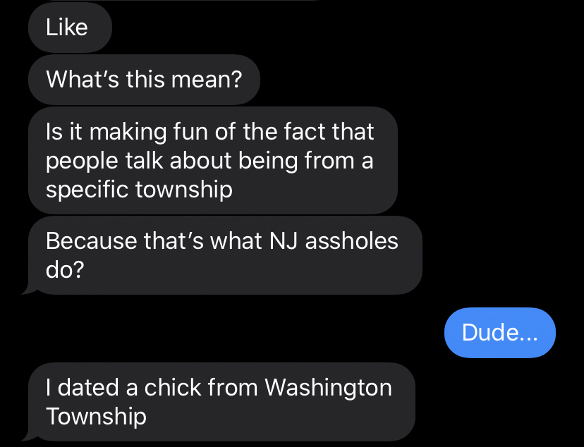 That being said, I was speaking with a friend who is also originally from Philly and now works in and with a lot of people from NJ and he mentioned the way in which people toss around the word “township.” And more specifically about how people from one specific area use it, but in that moment, I had a genuine flashback to something that happened to me when I lived in New Jersey the first time.